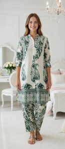 ✨ Classic, elegant & Eid-ready! 🌙🤍 Stunning white & grey paisley block print 2-piece co-ord set — a timeless desi look that never goes out of style! 🤍 Color: White base with grey print 🌸 Print: Bold paisley & floral ethnic block print 👗 Top: Longline kurta with mandarin collar & 3/4 sleeves 👖 Bottom: Matching printed tapered trousers with geometric border detail 🪡 Fabric: Soft cotton — light, cool & comfortable ✨ Detail: Contrast geometric border at hem — so chic! The perfect everyday Eid outfit — modest, breezy & effortlessly put together 💫 Style with flat sandals for a relaxed look or heels for something more polished!