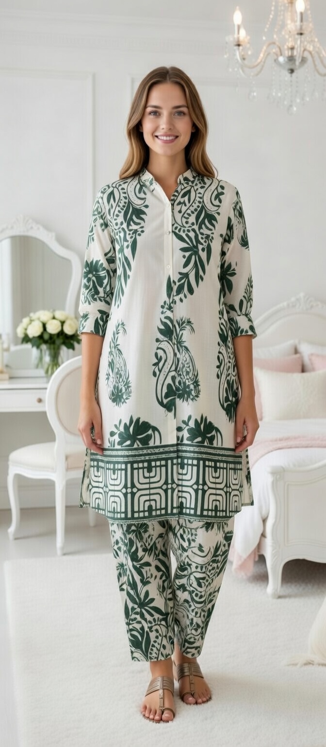 Off White & Forest Green Paisley Print Co-ord Set – Kurta + Trouser