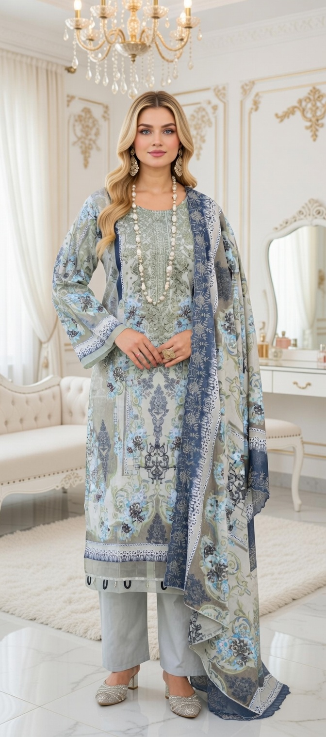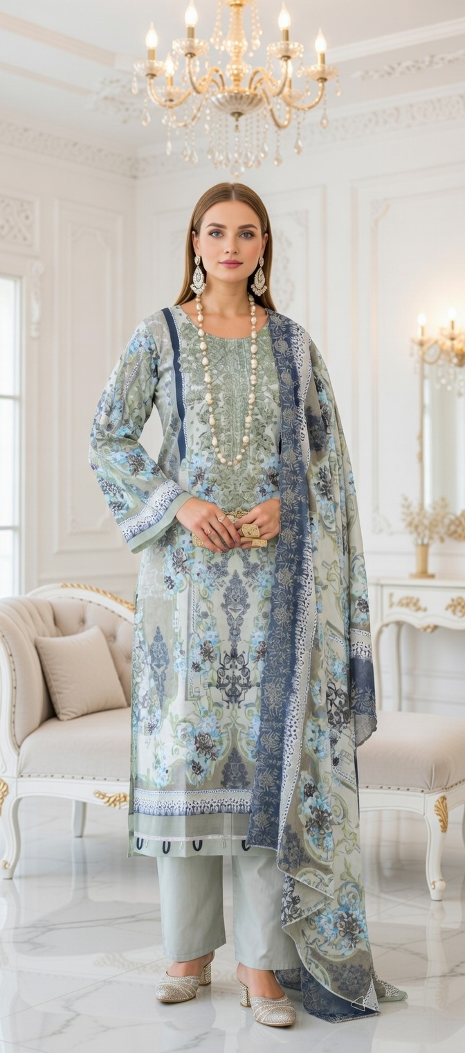 ✨ Classic Pakistani Eid dressing at its finest! 🌙🩵 Stunning 3-piece printed lawn suit in sage green & blue — intricate floral & mughal motif print with a matching printed dupatta. Pure elegance! 🩵 Color: Sage green, blue & grey tones 🌸 Print: Detailed floral & mughal heritage print ✨ Detail: Embroidered neckline — so beautiful! 👗 Top: Full sleeves kurta with round neck & printed border hem 👖 Bottom: Plain grey straight-leg trousers 🧣 Dupatta: Matching printed dupatta with navy border & tassel trim — included! 🪡 Fabric: Premium summer lawn — cool, crisp & breathable The complete ready-to-wear Eid look 💫 Just wear & go — kurta, trouser & dupatta all included. Perfect for Eid day, dawat or any festive occasion!