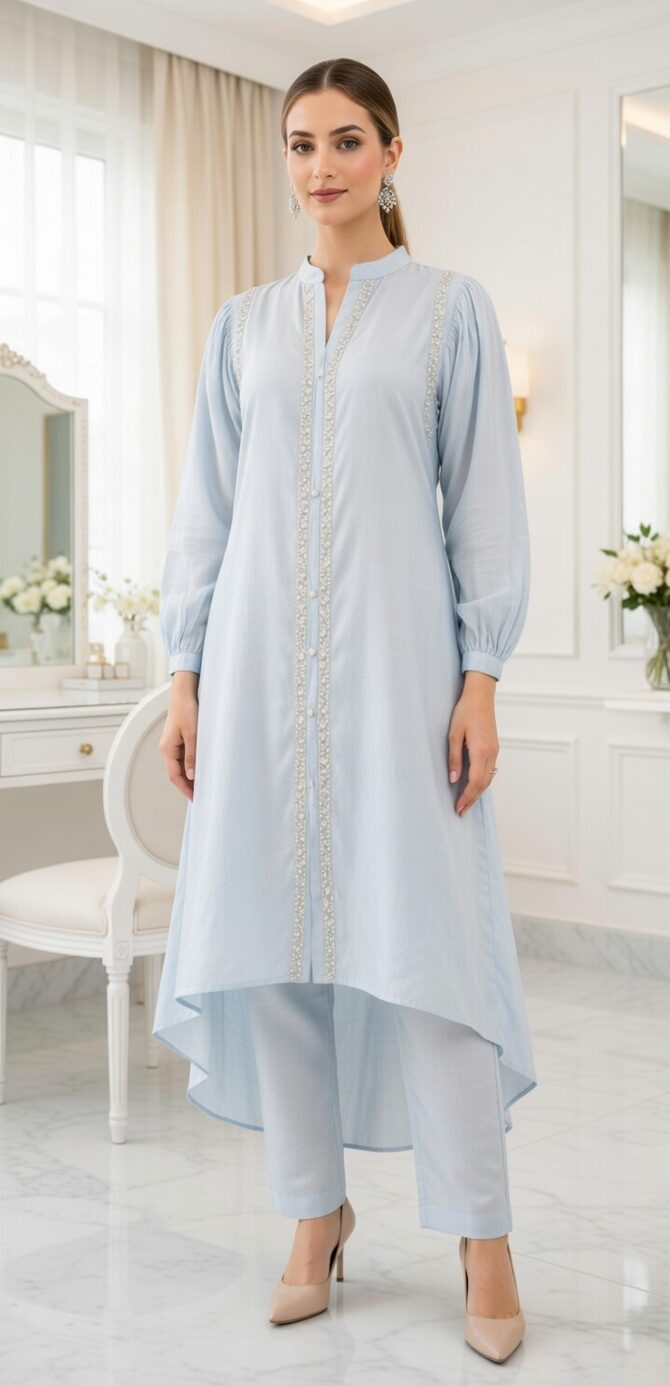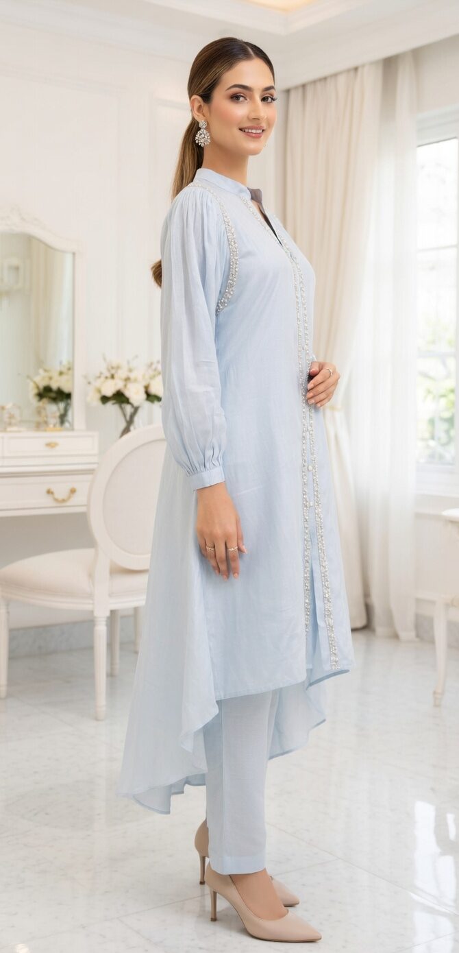 ✨ Soft, dreamy & absolutely Eid-perfect! 🌙🩵 Gorgeous sky blue 2-piece set with a stunning hi-low hem — effortlessly elegant and so unique! 🩵 Color: Soft sky / baby blue ✨ Detail: Delicate pearl & lace trim running down the front — so luxurious! 👗 Top: Hi-low longline kurta with mandarin collar & puff full sleeves 👖 Bottom: Matching straight-leg trousers 🪡 Fabric: Soft & flowy — light as a cloud 💫 Silhouette: Dramatic hi-low hem — elegant from every angle! This one is giving soft glam Eid energy 🕊️💙 Style with silver chandelier earrings & nude heels — exactly as shown & absolutely stunning!